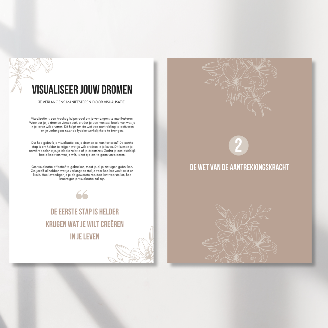 Dit e-book bevat 37 pagina's vol waardevolle inzichten, tips en praktische tools om jouw manifestatiereis te ondersteunen:
